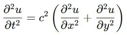 ここで、u(x,y,t)u(x, y, t) は時間と空間における波の振幅、cc は波の速さを表します。