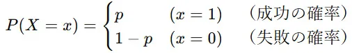 確率質量関数(PMF, Probability Mass Function) とは、離散確率変数が特定の値をとる確率を表す関数です。ベルヌーイ分布の確率質量関数は次のように定義されます。