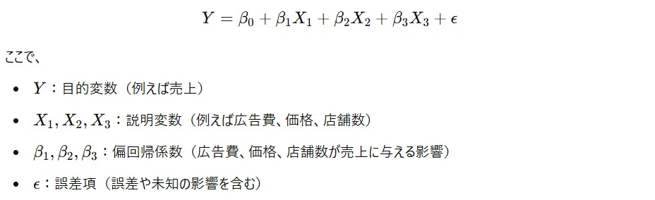 重回帰分析 複数の説明変数が目的変数に与える影響を同時に分析 すべての説明変数を考慮 広告費・価格・店舗数が売上に与える影響を分析